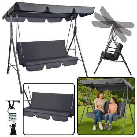 Kényelmes, háromszemélyes kerti hinta párnákkal és matraccal a tökéletes pihenéshez ☀️ Élvezze a pihenést a szabadban ezzel a stílusos és kényelmes kerti hintával! Akár egyedül szeretne relaxálni, akár a családdal és barátokkal töltene időt, ez a hinta ideális választás. Főbb jellemzők:Háromszemélyes: Kényelmesen elfér rajta akár 3 személy is. Ágyazható: Könnyedén átalakítható fekvőfelületté a még nagyobb kényelemért. ? Tartós: Porszórt acélváza biztosítja a stabilitást és az időjárásállóságot. Kényelmes: A vastag matrac és a két párna gondoskodik a maximális komfortról. Árnyékoló tető: Védelmet nyújt a nap káros sugarai ellen. ⛱️ Műszaki adatok:Jellemző ÉrtékÜlőhelyek száma Akár 3 főÁgyazható IgenHintázási lehetőség IgenVáz anyaga Porszórt acélMatrac Tartozék, vastag és puhaPárnák 2 db, tartozékMaximális terhelés 250 kgTető Fix, integráltMéretek kb. 200 x 120 x 164 cmSzín Szürke árnyalataiIdeális választás: Kertekbe Teraszokra Erkélyekre Pavilonokba A csomag tartalma: Acélváz Kerti matrac 2 db párna Ez a kerti hinta nem csupán egy bútor, hanem egy meghívás a mindennapi pihenésre és kikapcsolódásra. ?